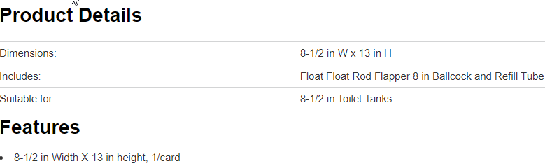 Economy kit for 8-1/2 in tanks. Includes float, 8 in ballcock, flapper and float rod.