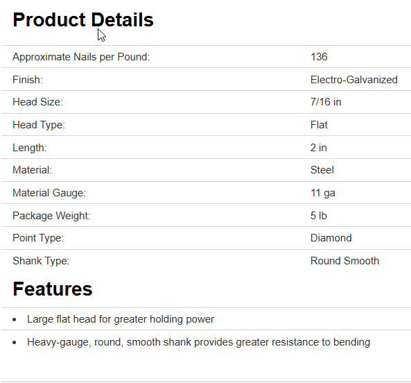 ProFIT Hand Drive Roofing Nail, Head Size: 7/16 in, Head Type: Flat, Shank Type: Round, Smooth, Point Type: Diamond, 2 in L, Material Gauge: 11 ga, Steel, Electro-Galvanized, Approximate Nails per Pound: 136, Package Weight: 5 lb