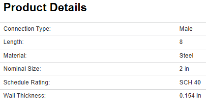 Pipe Nipple, 2 in, Butt Weld, 0.154 in Thick Wall, Schedule Rating: SCH 40, Carbon Steel, 8 in L,