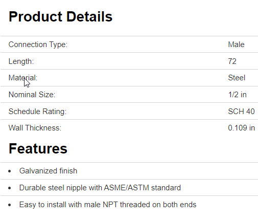 Pipe Nipple, 1/2 in, Butt Weld, 0.109 in Thick Wall, Schedule Rating: SCH 40, Carbon Steel, 72 in L
