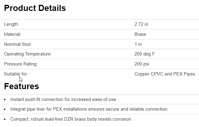 The SharkBite® straight coupling is the easiest plumbing fitting to join any combination of Copper, PEX, CPVC, PE-RT or SRD9 HDPE pipe together. With no soldering, clamps, unions or glue required, it's as simple as inserting the pipe into the fitting deep enough to be sealed by our specially formulated O-ring. Once inserted, the stainless steel teeth bite down and grip the pipe. This push to connect fitting is designed for potable water and radiant heating (including underground or behind the wall) applications with no access panels required. It is rated up to 200 deg F and 200 psi.