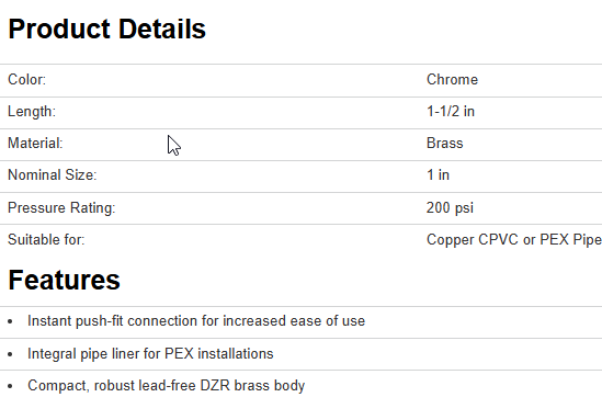 SharkBite® end caps are push to connect and are the easiest way to cap off your copper, PEX, CPVC or PE-RT pipe lines. There is no soldering, clamps, unions or glue required. These fittings are great for stub outs and pressure testing a home as they take no time to cure. They are easily removed with a disconnect clip. All SharkBite® fittings are capable of being installed on either wet or dry pipe. This product is rated for up to 200 psi and 200 deg F.