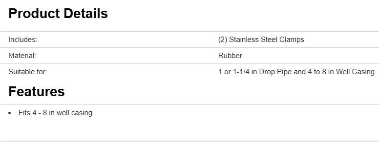 Fits 1 in or 1-1/4 in drop pipe, 4 in to 8 in well casing. Supplied with two stainless steel clamps.