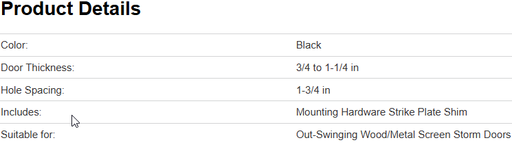 Wright Products most popular pushbutton latch, this latch can be used on most storm or screen doors with 1-3/4 in hole spacing. The inside latch contains our 'No Lock Out' feature eliminating the worry of accidentally being locked out of your home.