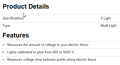 The Zareba® multi-light electric fence tester makes it easy to measure the amount of voltage in your electric fence. Our electric fence tester measures the voltage drop between points along an electric fence. The lights on our tester are calibrated to glow from 600 to 5500 V.
