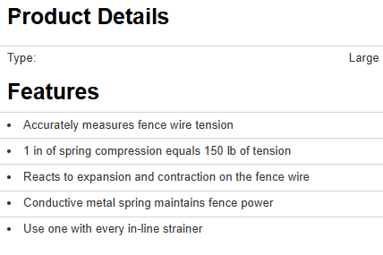 Used to indicate tension of wire. One inch of compression equals 150 lb of pull. Use one in conjunction with in-line strainer for each leg of fence. Electroplated to deter rust.
