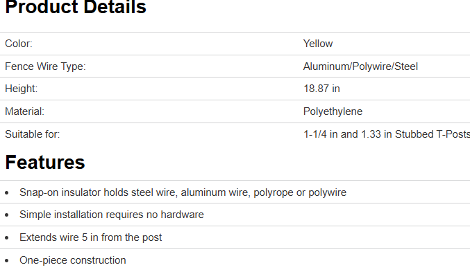 The Zareba® yellow snap-on 5 in extender T-post Insulator extends the wire 5 in from the post. This yellow insulator fits securely on standard (1-1/4 in or 1.33 in) studded T-posts. No hardware is needed to put this insulator on a post.