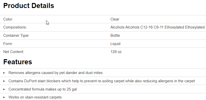 Premium carpet shampoo concentrate helps remove allergens caused by pet dander and dust mites. It is ideal for use in deep cleaning steam machines and extractor machines and works on stain-resistant carpets. The special formula contains DuPont stain blockers which help to prevent re-soiling carpet while also reducing allergens in the carpet. The concentrated formula makes up to 25 gal.